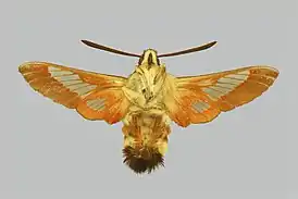 Размах крыльев 4—5 см. От прочих видов своего рода отличаются наличием беловатой поперечной полосы на третьем абдоминальном тергите. Задние крылья оранжевые, а передние в основном — коричневые. Аролии отсутствуют. Внешне напоминают шмелей (брюшко сверху пушистое, усики веретеновидные). Пьют нектар не садясь на цветки, а зависают возле них в воздухе. Встречаются на высотах до 6200 м. Гусеницы питаются на растениях родов жимолость (Lonicera) [2].