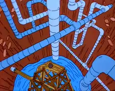 Гомер сооружает запутанную сеть труб, через которые он отправляет шары для боулинга с незаконным алкоголем в Таверну Мо | |