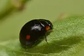 Жук длиной до 4,2 мм. Тело почти круглое, имеет чёрную окраску. На надкрыльях имеется одно красное пятно, расположенное ближе к середине[1].