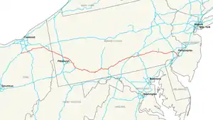 I-76 пересекает Пенсильванию на юге штата. Вскоре после пересечения границы магистраль огибает с севера город Питтсбург. Затем магистраль соединяется с Interstate 70. На протяжении почти 140 км, на которых магистрали соединены, с них имеются всего три развязки, так как их маршрут проходит через малонаселённые предгорья Аппалачей. После этого I-70 уходит на юг, в сторону Балтимора, а I-76 двигается на восток, к Филадельфии. Дальнейший путь магистрали проходит к югу от городов Гаррисберг и Рединг. После пересечения реки Саскуэханна I-76 поворачивает на юго-восток, в сторону центра Филадельфии, обходя его с юга.