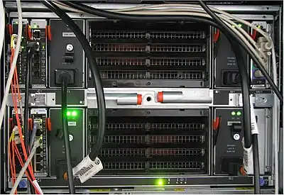 Два слота корзины выделено для Ethernet-коммутаторов (также поддерживается транзитный канал с оптическим или медным кабелем), два слота для опциональных модулей коммутации или транзитных каналов, которые могут поддерживать дополнительные функции Ethernet, Fibre Channel, InfiniBand или Myrinet 2000.