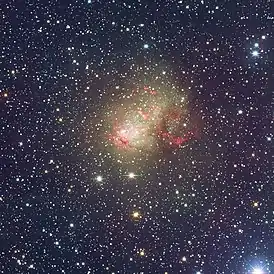 IC 10 — неправильная галактика в созвездии Кассиопея. Она была обнаружена Льюисом Свифтом в 1887 году. Николас Майалл в 1935 году предположил, что объект является внегалактическим. Эдвин Хаббл подозревал, что она может принадлежать к Местной группе галактик, однако её статус оставался неопределённым в течение десятилетий. Лучевая скорость IC 10 была измерена в 1962 году, и было установлено, что она движется по направлению ко Млечному Пути со скоростью в 350 км/с, что усилило доказательства её членства в Местной группе. Окончательно её принадлежность к Местной группе была подтверждена в 1996 году прямыми измерениями расстояния на основе наблюдения цефеид. Несмотря на свою близость, галактика довольно трудна для изучения, потому что находится вблизи плоскости Млечного Пути[4].