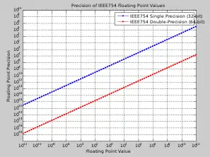 Как было указано ранее, форматы binary32 и binary64 идентичны форматам IEEE 754—1985 и являются двумя наиболее распространенными форматами, используемыми сегодня. На рисунке справа показана абсолютная точность для форматов binary32 и binary64 в диапазоне от 10−12 до 1012. Такой показатель может быть использован для выбора подходящего формата с учётом ожидаемого значения числа и требуемой точности.
