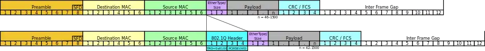 При использовании стандарта Ethernet II, 802.1Q вставляет тег перед полем «Тип протокола». Так как фрейм изменился, пересчитывается контрольная сумма.