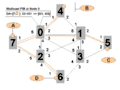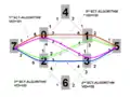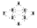 Сеть, показанная ниже [в рисунке 1], состоит из 8 участвующих узлов, пронумерованных 0 до 7. Они были бы коммутаторами или маршрутизаторами, выполняющими протокол IEEE 802.1aq. У каждого из 8 участвующих узлов есть много соседних узлов, пронумерованных 1.. 5. Они, вероятно, соответствовали бы интерфейсным индексам, или возможно номерам портов. С тех пор, как 802.1aq не поддерживает интерфейсы параллели, каждый интерфейс соответствует смежности. Порт / индексы интерфейсов локальны и показаны, потому что вывод вычислений производит интерфейсный индекс (в случае одноадресной передачи) или ряд интерфейсных индексов (в случае многоадресной передачи), которые являются частью базы данных переадресации (FIB) вместе с целевым MAC-адресом и магистралью VID.