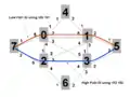 Рассмотрим маршрут от Узла 7 к Узлу 5: есть много равных по стоимости путей. 802.1aq определяет, как выбрать два из них: первое упоминается как путь Low PATH ID. Это путь, у которого есть минимальный идентификатор узла на нём. В этом случае путь Low PATH ID — 7->0->1->5 (как показано в красном в рисунке 2). Поэтому каждый узел на том пути создаст передающую запись к MAC-адресу узла пять использований первого ECMP VID 101. С другой стороны, 802.1aq определяет вторую связь ECMP, повреждающую алгоритм под названием High PATH ID. Это путь с максимальным идентификатором узла на нём, и в примере путь 7->2->3->5 (показанный в синем в рисунке 2). Поэтому узел 7 будет иметь FIB, который среди прочего указывает: