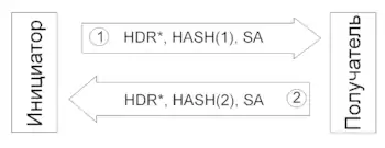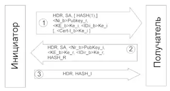Причина возможной отсылки HASH(1) та же что и в простой идентификации с помощью шифрования открытым ключом. Ключи Ke_i и Ke_r согласуются во время обмена данными SA. Данные шифруются, а заголовки данных передаются открытым текстом.