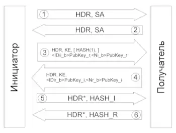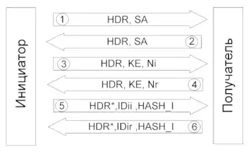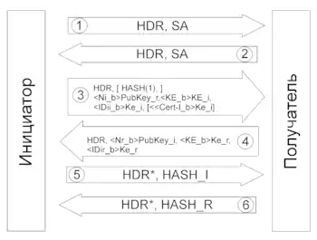 В основном режиме на этапах 1 и 2 стороны согласовывают SA IKE и договариваются о настройках обмена. Необходимо, чтобы обе стороны передали свои cookies. На 3 и 4 этапах стороны обмениваются ключами Диффи-Хеллмана и псевдослучайными значениями. После этого стороны могут защищать сообщения. На этапах 5 и 6 происходит обмен зашифрованной информацией идентификации.