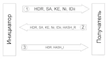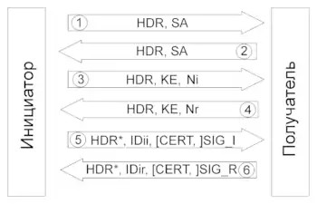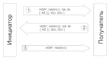 HDR — заголовок ISAKMP. Его поле типа обмена определяет режим. Если пишется HDR*, то данные зашифрованы.