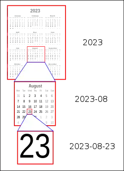 Значения даты и времени расположены в порядке от более к менее значимому. Каждое число (год, месяц, день, время) записывается с фиксированным числом знаков и, при необходимости, должно быть дополнено до него ведущими нулями. Например, время «7:40» должно быть записано как «07:40». В результате для каждого из ряда форматов дат и времен лексикографический порядок соответствует хронологическому, с исключением для отрицательных лет.