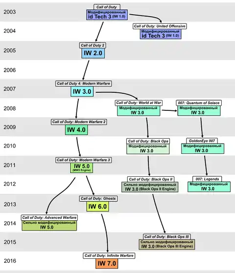 За Modern Warfare последовала Call of Duty: World at War 2008 года. На сей раз разработкой игры занималась студия Treyarch, а в основу движка был положен IW 3.0, при этом он был доработан силами сотрудников Treyarch. Все последующие игры серии, разработанные Treyarch, уже базировались на этой модификации третьей версии движка: с каждой новой частью компания улучшала движок, основанный на IW 3.0, тогда как Infinity Ward продолжала развитие ветви (новые цифровые индексы в названии, например, 4.0, 5.0 и пр.) добавлялись именно к ветви Infinity Ward).