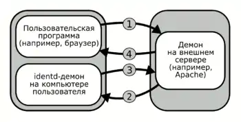 Начальные условия: на компьютере клиента работает identd. Клиент обращается к внешнему серверу, который умеет выполнять ident-проверку.
