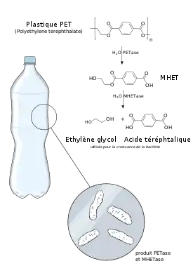 Предполагаемый механизм разрушения ПЭТ бактериями Ideonella sakaiensis таков. Вначале внеклеточный фермент ПЭТаза (фермент, гидролизующий ПЭТ) разлагает ПЭТ до моно(2-гидроксиэтил)терефталевой кислоты (основной продукт) и терефталевой кислоты (побочный продукт). ПЭТаза Ideonella sakaiensis имеет лишь 51 % сходства аминокислотной последовательности с другим ферментом, способным гидролизовать ПЭТ — гидролазой бактерии Thermobifida fusca. Моно(2-гидроксиэтил)терефталевая кислота гидролизуется соответствующим ферментом (предполагаемым липопротеином) до терефталевой кислоты и этиленгликоля. Терефталевая кислота доставляется в клетку через специальный белок-переносчик и последовательно катаболизируется двумя ферментами до протокатеховой кислоты. Затем специальная 3,4-диоксигеназа разрушает ароматическое кольцо протокатеховой кислоты[2].