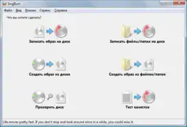 Программа позволяет записывать и считывать образы дисков, а также отдельно создавать образы, не записывая их, или же работать в режиме записи файлов и папок. Также есть режим проверки диска.
