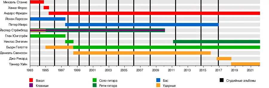 ↑ * В 1997—2011 годах Никлас Энгелин время от времени был гастрольным гитаристом In Flames, первое время заменяя покинувшего группу в 1997 году Гленна Юнгстрёма, а затем — тогдашнего участника Йеспера Стрёмблада, когда последний боролся с алкоголизмом. С начала 2019 года Никлас не ездит с группой в туры по неизвестным точно причинам. Несмотря на это, он несколько раз заявлял, что он не покидал In Flames и все ещё в группе. На концертах его заменяет Крис Бродерик. На текущий момент статус участия Никласа в группе не определен.