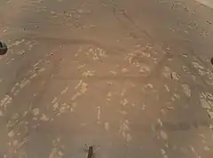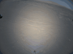 Поскольку оптическая ось навигационной камеры NAV перпендикулярна плоскости днища фюзеляжа, то размер выступа его тени за тень панели и смещение этого выступа относительно центра панели складываются за счёт: 1) высоты Солнца над горизонтом, 2) отклонения оси аппарата от вертикали и 3) наклона поверхности, на которую его тень спроецирована[lower-alpha 1]. Как таковой, соосный вертолёт может с равным успехом двигаться любой стороной фюзеляжа вперёд: программа обработки изображений, поступающих от камеры NAV, немедленно учитывает все повороты фюзеляжа. В 6-м и 10-м рейсах некоторые отрезки Ingenuity проходил «боком вперёд», а трассу 11-го полёта и вовсе прошёл «задним ходом», развернувшись после набора высоты на 180°[25].