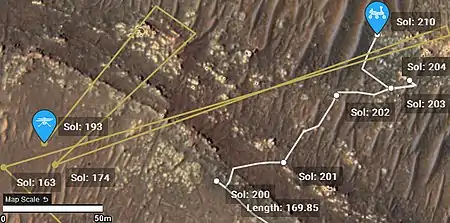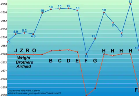 «Земные» способы определения местоположения воздушного судна в пространстве для марсианского воздухоплавания не подходят: слабость и неустойчивость магнитного поля Марса не позволяет использовать компас, а высокоточные гироскопические приборы и средства ориентации по Солнцу[40] выходят за пределы грузоподъёмности марсолёта. Вместе с тем, воздушная навигация необходима здесь в полном наборе инструментов определения навигационных элементов (высота, скорость курс и т. п.) и приёмов коррекции маршрута. Ветры на Марсе малопредсказуемы, и наличие метеостанции (на Perseverance — MEDA) обязательно. Большинство рейсов Ingenuity проходили при ветрах 4-6 м/с; по косвенным данным об осцилляциях в полёте сила ветра возрастает с высотой[41].