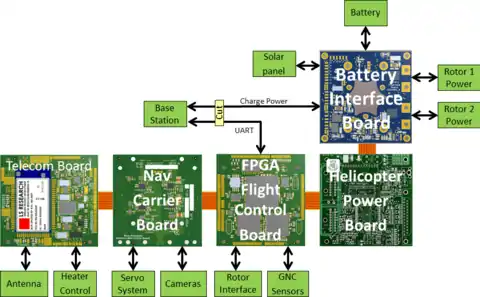 - плата энергоснабжения вертолёта HPB англ. Helicopter power board — два преобразователя DC/DC, регулирующие напряжение батарей между 3,3 В и 5 В.