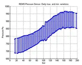 При подготовке экспедиции Марс-2020 ориентировались на наблюдения метеостанции Curiosity, зафиксировавшей в кратере Гейла, помимо сезонных, также и суточные колебания атмосферного давления от 780 Па в утренние до 700 Па и ниже[31] в вечерние часы. Примерно такой же диапазон наблюдается и в кратере Езеро, но абсолютная величина давления оказалась здесь на 100 паскалей ниже. Пополнение истощённого за ночь заряда батарей начинается медленно, на низких углах Солнца над горизонтом, но задержка старта ухудшает условия полёта. В предполётной документации старты предполагались в 11 часов местного времени при плотности 0,016÷0,0175 кг/м³[32]; по прибытии на Марс эта цифра была сдвинута на 1÷1,5 часа вперёд, и Ingenuity обычно взлетает после полудня.