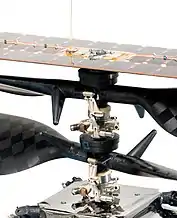 Несущим элементом конструкции аппарата служит крестообразная платформа, поставленная на раскосые стойки, расходящиеся примерно под ~45°. Каждая стойка сопряжена со своей балкой крестовины через амортизаторы. Сверху на середину крестовины установлена колонка соосных винтов вертолёта (диаметр лопастей 1210 мм), поверх которой прикреплена панель солнечных батарей размером 425×165 мм[8].