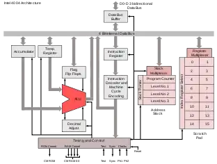 - 4001 — 256-байтовое масочное ПЗУ (256 8-битовых программных инструкций) и один встроенный 4-битный порт ввода-вывода.
