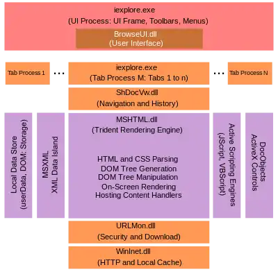 Internet Explorer использует компонентную архитектуру на технологическом стандарте Component Object Model. Она состоит из нескольких главных компонентов, каждый из которых помещён в отдельную динамически подключаемую библиотеку (DLL) и отображает набор инструментов интерфейса программирования приложений COM с хостингом в главном исполнимом модуле Internet Explorer, iexplore.exe[48]: