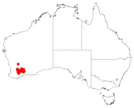 Эндемик Западной Австралии. Растёт в кустарниках и долинах между Дундинином, Кукерином, горами Холланд и Хаттерс-Хилл в биогеографических регионах Эйвон-Уитбелт, Кулгарди и Малли на юго-западе Западной Австралии[3][4].