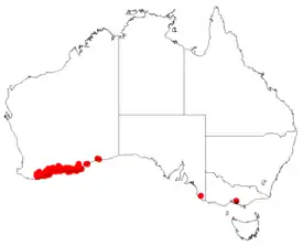 Эндемик Западной Австралии. Встречается от хребта Стерлинг на восток до залива Израэлит вдоль южного побережья Западной Австралии, где он растёт на песчаных равнинах, дюнах или скалистых обнажениях, на песчаных почвах, иногда над латеритом, в пустошах или кустарниковых сообществах[3].