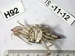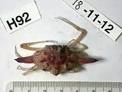 Мелкие ракообразные, длина тела около 5 см. Имеют поперечно-овальную форму головогруди, которая растянута в боковом направлении, образуя цилиндрический отросток с каждой стороны, покрытый бугорками. Лоб раздвоенный, орбиты глубокие и полностью нависают над глазами с тремя углублениями на их внешних краях. Задний край с двумя гранулезными бугорками. На дорсальной поверхности панциря имеются две продольные бороздки. Передние конечности с тонкими длинными клешнями. Панцирь бледно-красновато-оранжевого цвета с более интенсивно окрашенными гранулами, боковые отростки бледнее к концам, хелипеды с клешнями оранжевые, грудные конечности-переоподы бледно-оранжевые[4][5].