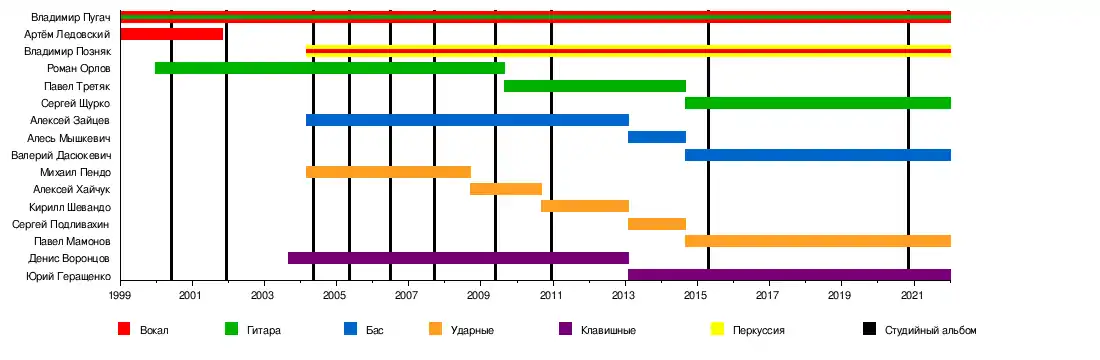 Владимир Пугач — вокал, гитара Владимир Пугач — вокалист, лидер группы, один из её основателей. Является автором абсолютного большинства песен. Также играет на гитаре. Родился 18 апреля 1976 в Пинске. В 1993 году поступил в Европейский гуманитарный университет, в 1998 году окончил его по специальности международное право. До 2005 года был практикующим юристом. На сцене начал выступать в школе. В 1997 году вместе с другом и одноклассником Артёмом Ледовским создал дуэт «No Logo», в котором оба писали свои песни и поочередно выступали в роли вокалистов.
