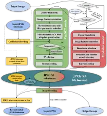 - VarDCT (дискретное косинусное преобразование (ДКП) с переменным размером блока) — использует тот же алгоритм ДКП, что и устаревший JPEG, но блоки вместо ограничения 8x8 имеют различные размеры (от 2x2 до 256x256), неквадратные формы (например, 16x8, 8x32, 32x64) или могут использовать другие преобразования (AFV, Hornuss).