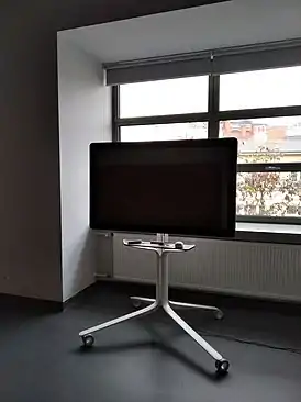 Устройство может быть закреплено на стене или на вертикальной подножке с колесиками. В настоящий момент Jamboard представлена в 3 цветах — красном, синем и черном[5].