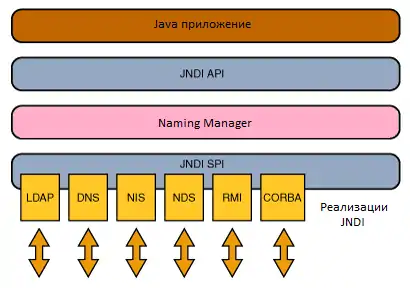 Java Naming and Directory Interface (JNDI) — это набор Java API, организованный в виде службы каталогов, который позволяет Java-клиентам открывать и просматривать данные и объекты по их именам. Как любое другое Java API, как набор интерфейсов, JNDI не зависит от нижележащей реализации. В дополнению к этому, он предоставляет реализацию service provider interface (SPI), которая позволяет службам каталогов работать в паре с каким-либо фреймворком. Это может быть сервер, файл или база данных[1].
