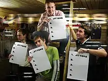 ![]() Группа «Jitters» поёт на фестивале «Rock bez Igły» 17 июня 2006 года, слева направо: Сергей Кондратенко, Константин Карман, Артур Лучков, Иван Борзенко | |