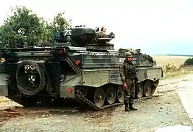 Two dead in Kosovo helicopter crash // «BBC News» от 9 апреля 2001 - 14 апреля 2001 у деревни Кривеник при подрыве на мине бронемашины F.V.107 «Scimitar» был убит 1 и ранены 2 военнослужащих Великобритании