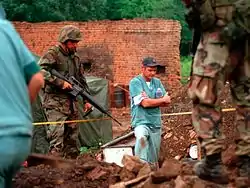 Морские пехотинцы США обеспечивают безопасность сотрудников Королевской канадской конной полиции во время исследования захоронения в косовской деревне 1 июля 1999 года.