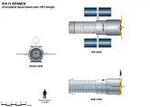 16 спутников KH-11 были запущены между 1976 и 2013 годами на борту ракет-носителей Titan IIID и Titan 34D, с одним аварийным пуском. Аппарат KH-11 заменил фотографические спутники KH-9 Hexagon, последний из которых был потерян при взрыве ракеты-носителя в 1986 году. Предполагается, что KH-11 напоминают по размерам и форме космический телескоп «Хаббл», так как их отправляли в космос в одинаковых контейнерах. Кроме того, НАСА, описывая историю телескопа «Хаббл»[4], в описании причин перехода от 3-метрового главного зеркала к 2,4-метровому, утверждает: «Кроме того, переход к 2,4-метровому зеркалу позволял снизить затраты на изготовление, используя производственные технологии, разработанные для военных спутников-шпионов».