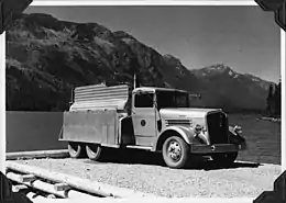 ![]() Kenworth Truck, оборудованный для перевозки живой рыбы на озере Веначи штат Вашингтон 1940-е годы |