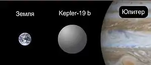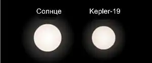![]() Сравнительные размеры Солнца и Kepler-19. | |