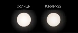 ![]() Сравнительные размеры Солнца и Kepler-22. | |