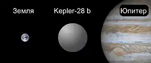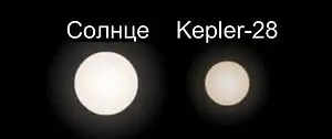 ![]() Сравнительные размеры Солнца и Kepler-28. | |