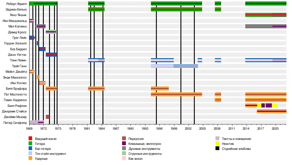- Роберт Фрипп — гитара, электро-пианино, меллотрон, клавишные (1968—1974, 1981—1984, 1994—2004, 2007—2009, 2013—наши дни)