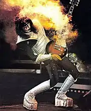 Хотя альбомы Kiss и не продавались крупными тиражами, группа быстро приобретала статус самой зрелищной[21]. Их концерты включали в себя множество разных трюков и уловок. Например, Джин Симмонс плевался «кровью» (на самом деле — смесью из йогурта, соков и пищевых красителей), взлетал при помощи тросов или «дышал огнём» (набирал в рот керосина и выпрыскивал его на факел); искры и дым (по отдельности) из концертной светящейся гитары Эйса Фрейли во время его виртуозных соло (фейерверки, скрытые в грифе, и дымовые шашки, скрытые в звукоснимателях гитары); поднимающаяся на высоту ударная установка с Питером Криссом, испускающая искры; Пол Стэнли, исполняющий сложные прыжки на своих 20-сантиметровых платформах и разбивающий гитару в стиле Пита Таунсенда; и множество пиротехники на протяжении шоу[21].