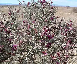 Цвет ветвей и растения от серо-зелёного до серого или бело-серого, а концы ветвей красноватые. Цветки одиночные и часто незаметные, но в некоторых областях растения цветут множеством красных цветков. Плоды односемянные, колючие.