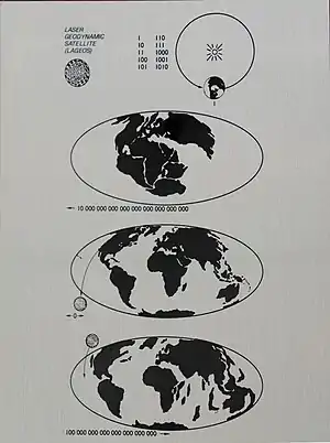 Внутри шара LAGEOS-1 находится пластинка из немагнитной нержавеющей стали размером 4×7 дюймов (10×18 см)[2] с выгравированным на ней посланием нашим далёким потомкам (см. рис.), которое разработал Карл Саган (незадолго до этого он же создал послание, размещённое на борту космических аппаратов «Пионер-10» и «Пионер-11», отправленных за пределы Солнечной системы). Вверху слева — изображение спутника LAGEOS-1. Затем представлены числа от 1 до 10 в двоичном коде (это позволяет гипотетическим читателям сообщения понять использующуюся ниже систему записи чисел) и схема, изображающая орбитальное движение Земли вокруг Солнца; под схемой нанесено число 1, означающее единицу времени (1 год) для нижеследующих схем; стрелка вправо на орбите Земли означает выбранное направление временной шкалы (слева прошлое, справа будущее). Ниже показаны три карты Земли — с расположением континентов около 270 миллионов лет назад, с их расположением на момент запуска и с предположительным расположением континентов через 8,4 миллиона лет после запуска. Под первым рисунком записано число в двоичном коде — единица с 28 нулями (в десятичном коде оно равно 268 435 456), и стрелка, указывающая налево, что должно означать «до запуска спутника». Под вторым рисунком нанесён ноль (то есть современность по шкале времени), на карте отмечено место, откуда был запущен спутник. Под третьим рисунком написано число 100 000 000 000 000 000 000 000 (в десятичной записи оно равно 8 388 608). На этом рисунке схематически показано падение на Землю спутника, который примерно к этому времени должен постепенно затормозиться в сверхразрежённых внешних слоях атмосферы[5][2].