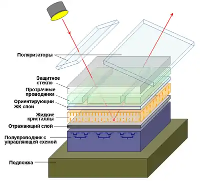 На полупроводниковой подложке LCoS-кристалла расположен отражающий слой, поверх которого находится жидкокристаллическая матрица и поляризатор. Под воздействием электрических сигналов жидкие кристаллы либо закрывают отражающую поверхность, либо открываются, позволяя свету от внешнего направленного источника отражаться от зеркальной подложки кристалла.