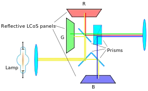 ![]() Упрощенная схема LCoS-матрицы c голографическим цветовым фильтром (HSF) — решение для одноматричных LCoS-устройств (SD-ILA) |