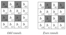 Ключевой частью шифра является решение, какие байты извлекать из промежуточного состояния и с какой частотой. Автор шифра предлагает извлекать байты в каждом нечетном раунде и байты в каждом четном (см. рис.2). Порядок байтов не имеет значения для безопасности, но важен для скорости шифрования. Вышеизложенный порядок байтов позволяет их извлечь из текущего состояния всего за 4 шага с помощью формулы: