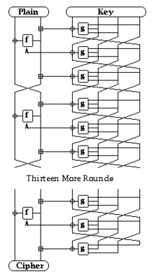 После чего эти слова проходят 16 раундов сбалансированной сети Фейстеля по следующему алгоритму: