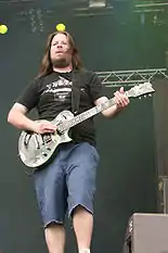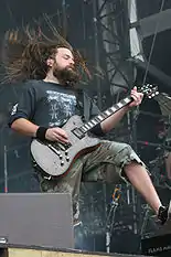 Участники Lamb Of God во время выступления на фестивале With Full Force в 2007 году (слева направо): Рэнди Блайт (вокал), Марк Мортон (соло и ритм гитара), Вилли Адлер (ритм гитара), Джон Кэмпбелл (бас гитара) | ||||||||||